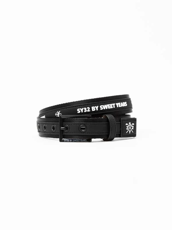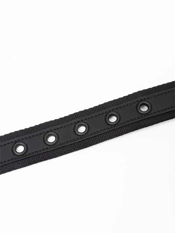 ナイロンテープとレザーを組み合わせた35mmベルト。好きな長さにカットして使用できるフリーカット仕様。ブランドネームがハッキリと打ち出され、ウエストにポイントを置いたコーディネートを引き立たせるアイテム。バックルにロゴに刻印、剣先に高周波プリントでロゴを配置。