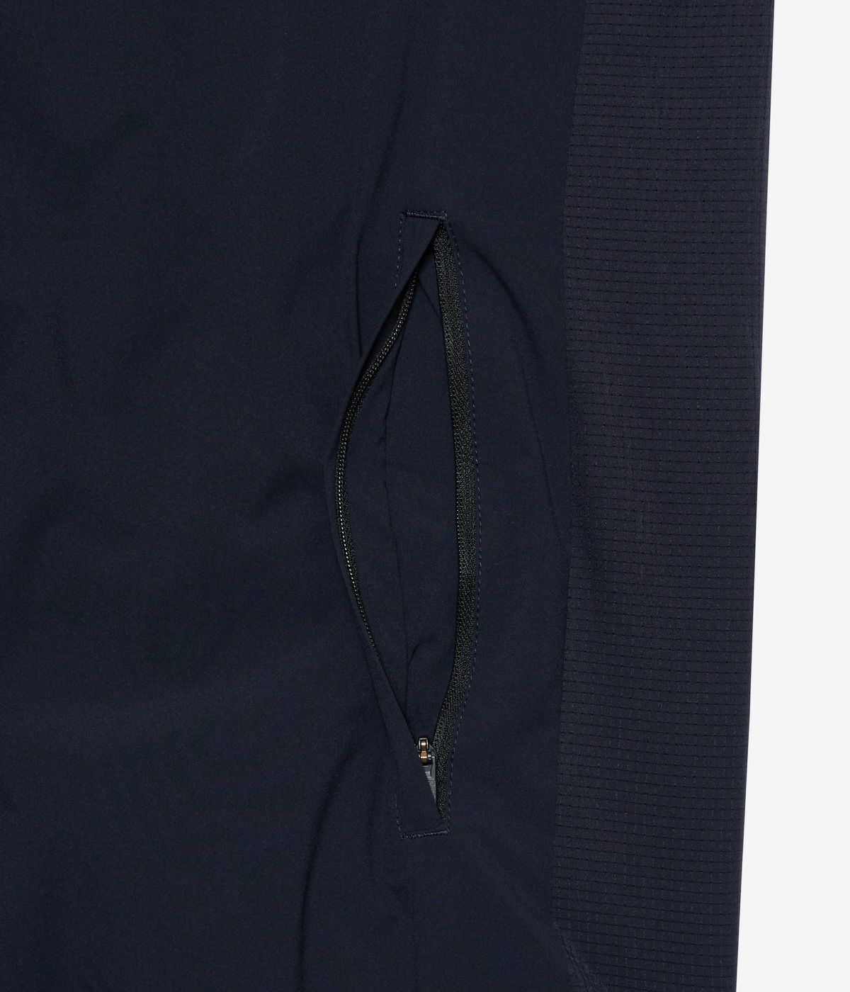 本体には、透湿性や撥水性を兼ね備えた機能素材を使用し、ソフトでしっとりとした質感が心地よいマイクロフリースを採用。繊細に編み込まれたニット構造が滑らかな表面感を生み、上品な印象へと導きます。さらにトーンオントーンの配色で切り替えた部分には、撥水性を持つマットな2WAYストレッチ素材を重ね、デザインに立体感と洗練されたアクセントをプラスしました。