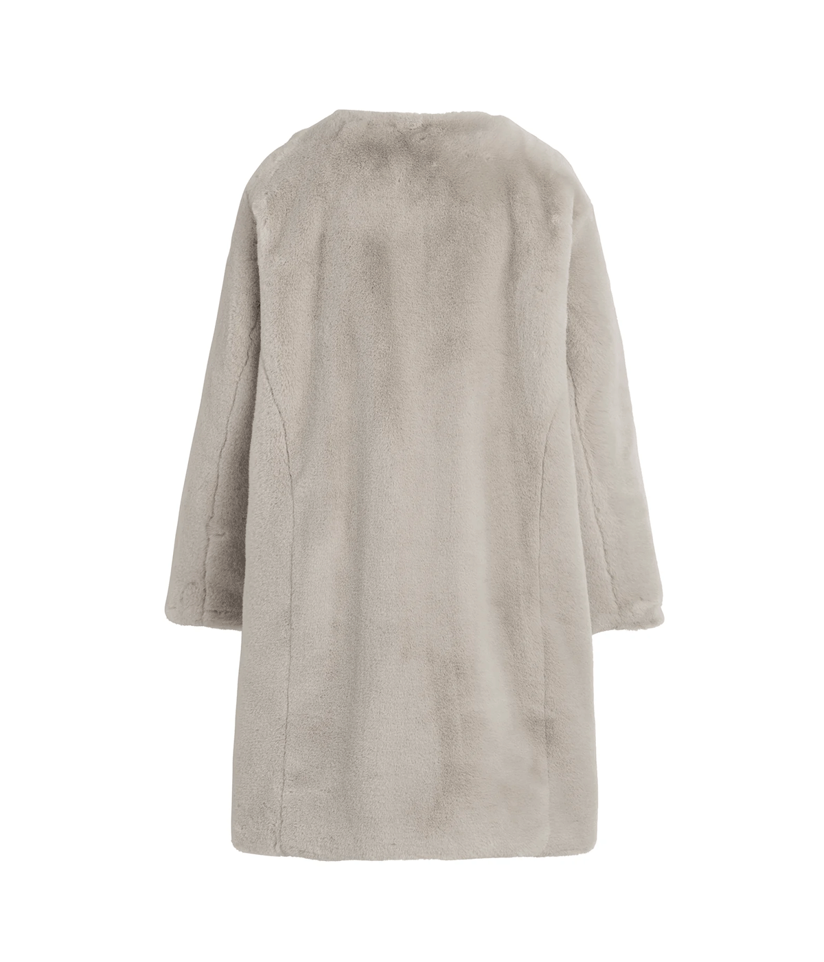 ラビットファーのような艶やかさを持つ、ポリエステル糸のエコファーを使用しているノーカラーコート。